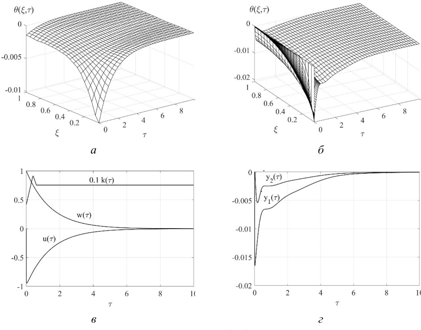 Рис. 5. Результаты анализа: а – функция θξ,τ, полученная по выражению (61); б – функция θξ,τ, полученная при моделировании динамической системы (56), (62); в – управление uτ, возмущение wτ, коэффициент kτ; г – переходные процессы по переменным y1τ, y2τ