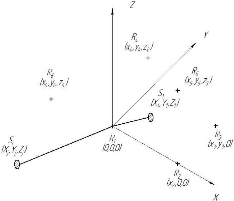 За начало координат измерительной системы (основная система координат) было принято положение первой опорной точки R1. Для того чтобы однозначно определить координаты контролируемых точек на обечайке, необходимо создать привязку четырех систем координат, связанных с четырьмя стоянками трекера. Для этого в процессе измерения обечайки нужно измерить и расстояние до опорных точек, чтобы в дальнейшем привязать системы координат стоянок трекера к основной системе координат. Тогда возможно определить координаты измеренных точек обечайки в единой системе координат. Для упрощения дальнейших расчетов желательно располагать стоянки трекера вдоль общих осей [7].