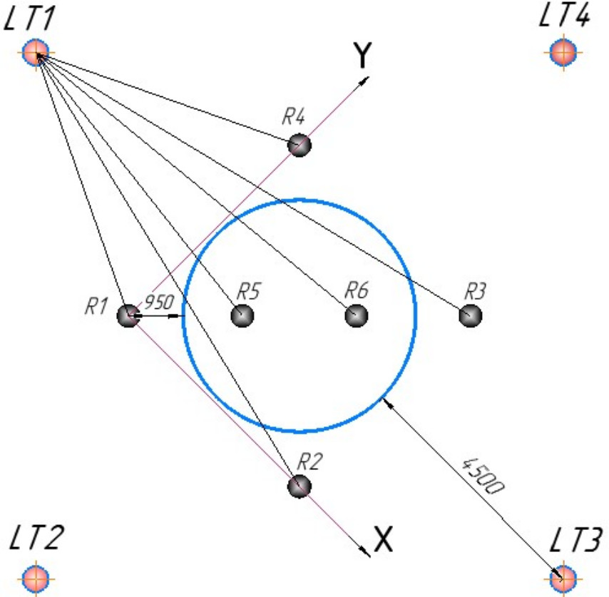 Расположение опорных точек Ri(xi; yi; zi) и стоянок трекера LTj(xj; yj; zj) приведено на общей схеме на рис. 6 и 7.