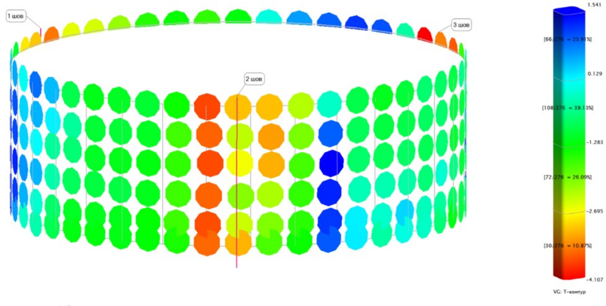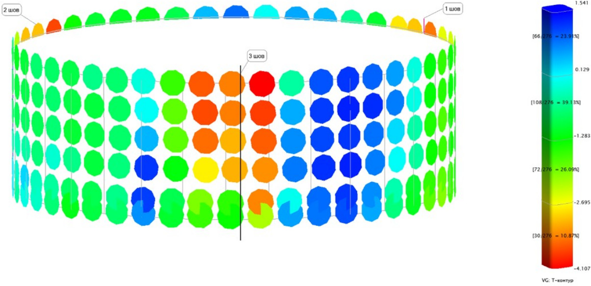 На рис. 9–12 показаны векторы отклонений от действительного размера. Знак «–» в значении отклонения означает, что вектор отклонения направлен внутрь обечайки. Максимальное отклонение от оси обечайки составило +1,541 мм; внутрь – 4,187 мм.