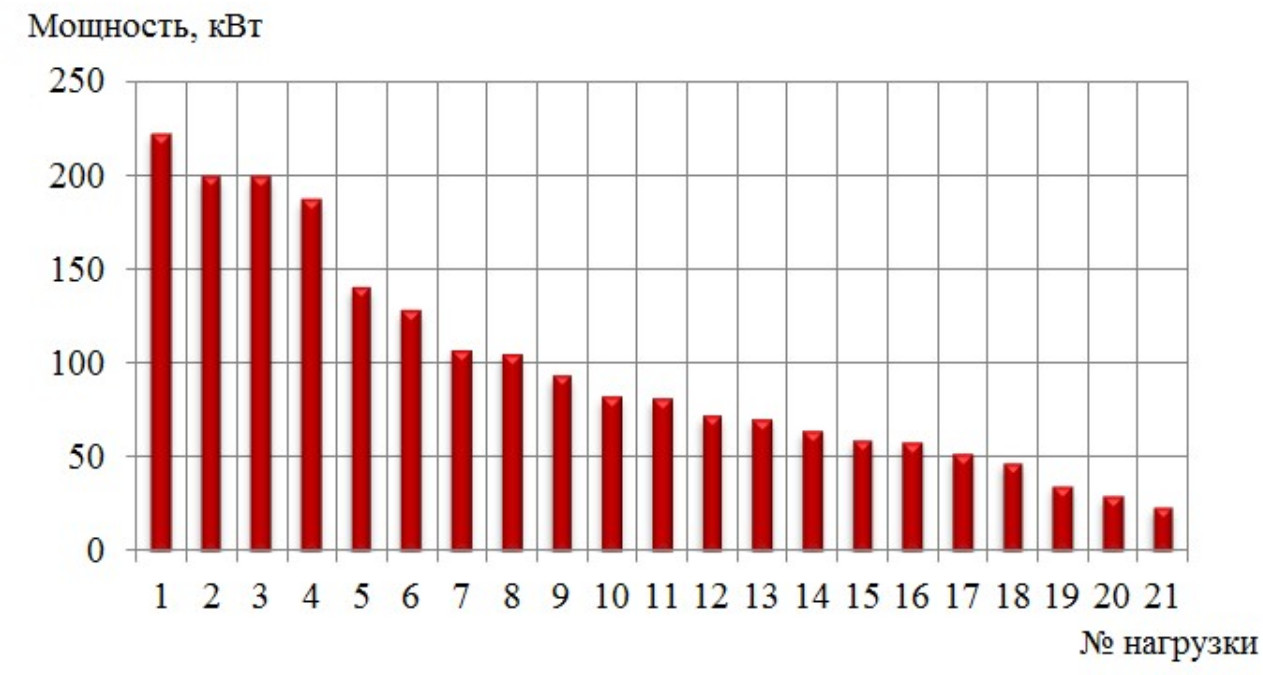 В некотором регионе имеется 21 центр нагрузки общей мощностью 2057 кВт. На рис. 2 показано распределение мощностей по этим центрам.
