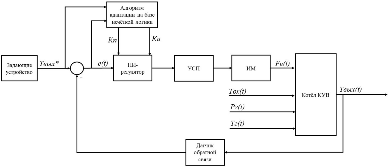 В качестве управляемой величины рассматривается температура сетевой воды на выходе котла-утилизатора. Управляющие воздействие – расход сетевой воды через поверхности нагрева котла. Для регулирования и поддержания заданного значения температуры сетевой воды на выходе котла КУВ используется ПИ-регулятор. Аппарат нечеткой логики используется для реализации алгоритма адаптации параметров ПИ-регулятора.