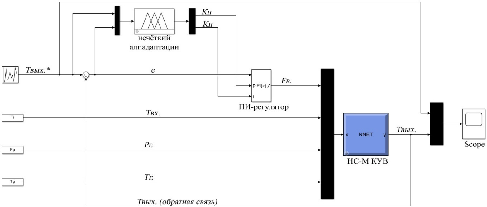 В результате выполнения всех этапов разработки адаптивной системы управления была разработана замкнутая система управления температурой сетевой воды на выходе котла КУВ. Замкнутая система управления представлена ПИ-регулятором с алгоритмом адаптации параметров на базе нечеткой логики. В качестве модели объекта управления использовалась нейросетевая модель котла-утилизатора. В качестве величины задания использовались равномерно распределенные случайные значения в диапазоне от 72 до 92 °С. Интервал изменения задания – 200 тактов. На рис. 2 приводится структура Simulink-модели, реализующей разработанную систему управления в пакете моделирования динамических систем Simulink пакета прикладных программ MATLAB.