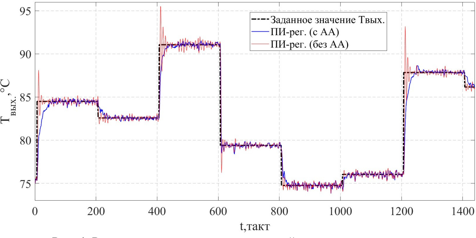 На рис. 4 приводятся результаты моделирования замкнутых систем управления с ПИ-регулятором без алгоритма адаптации (ПИ-рег. без АА) и с ПИ-регулятором с алгоритмом адаптации (ПИ-рег. с АА). ПИ-регулятор без алгоритма адаптации имел параметры , (набор параметров № 1, запас устойчивости по фазе °, максимальный запас устойчивости может быть задан °). Исходя из кривых переходного процесса в некоторых случаях при изменении в замкнутом контуре с ПИ-регулятором без алгоритма адаптации наблюдается перерегулирование и небольшой колебательный процесс. В замкнутом контуре управления с ПИ-регулятором и алгоритмом адаптации при изменении задания перерегулирование отсутствует, регулятор отрабатывает задание без потери качества управления. В отличие от регулятора с алгоритмом адаптации ПИ-регулятор без алгоритма адаптации более чувствителен к изменению переменных Tвх, Pг, Tг.