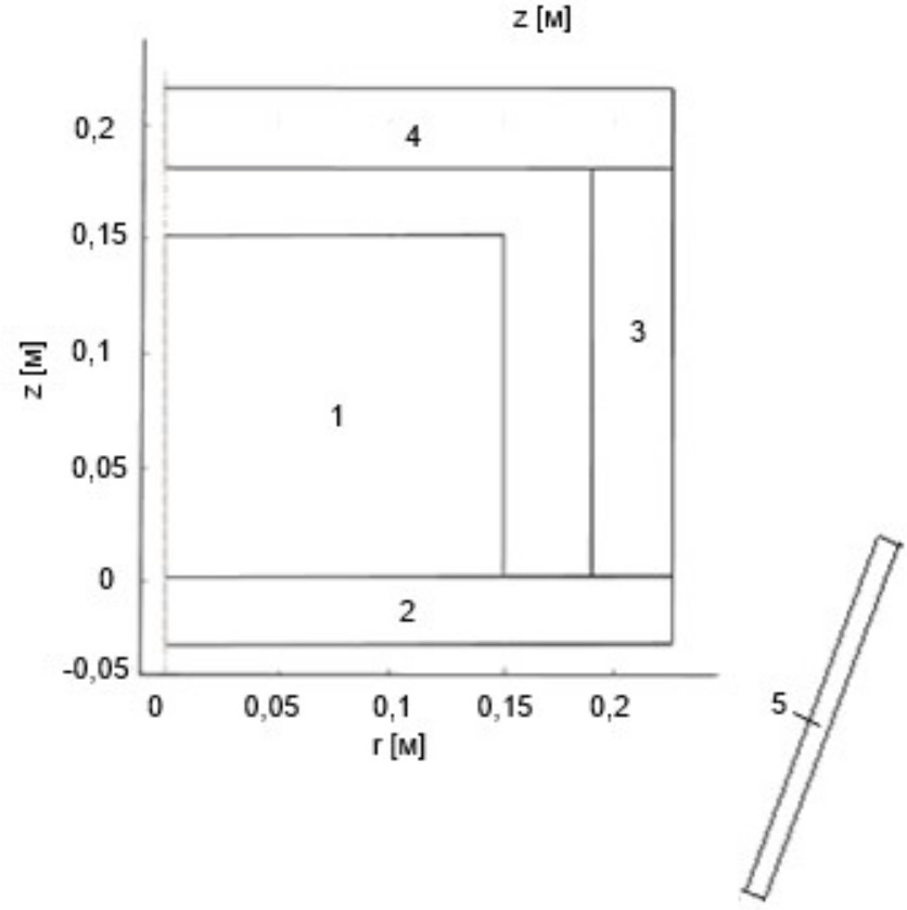 Рис. 1. Геометрическая модель электромагнитного кристаллизатора кремния: 1 – расплав кремния; 2 – подложка; 3 – боковая стенка тигля; 4 – крышка тигля; 5 – индуктор