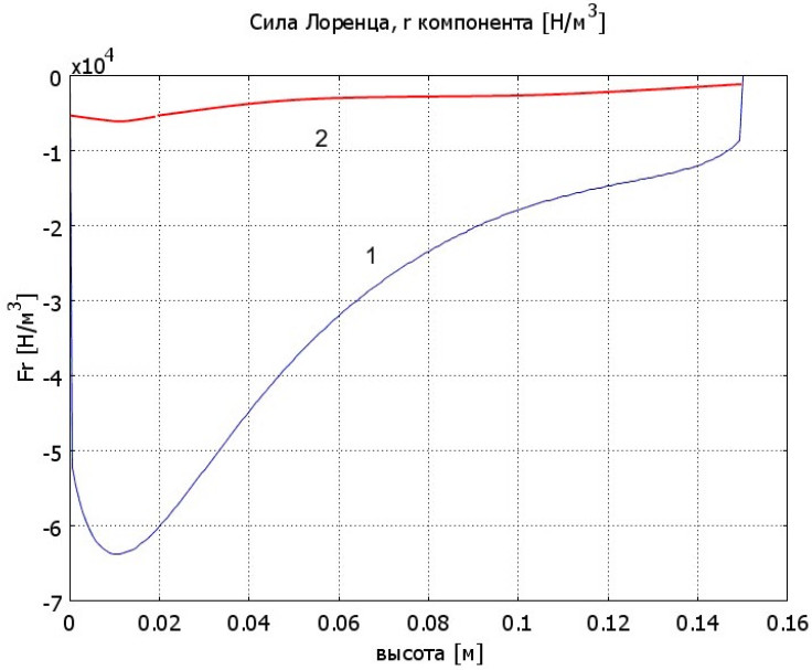 Рис. 2. Диаграммы распределения r-компоненты силы Лоренца по высоте слитка высотой 0,15 м: 1 – r = 0,15 м; 2 – r = 0,12 м
