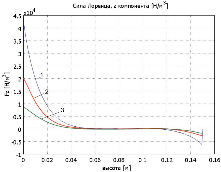 Рис. 4. Диаграммы распределения z компоненты силы Лоренца по высоте слитка высотой 0,15 м: 1 – r = 0,15 м; 2 – r = 0,12 м; 3 – r = 0,1 м