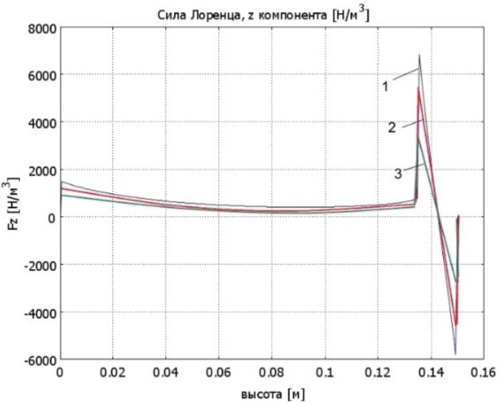 Рис. 5. Диаграммы распределения z компоненты силы Лоренца вдоль оси z для расплава высотой 0,015 м: 1 – r = 0,15 м; 2 – r = 0,12 м; 3 – r = 0,1 м