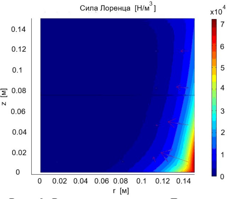 Рис. 6. Распределение силы Лоренца в расплаве кремния высотой 0,15 м
