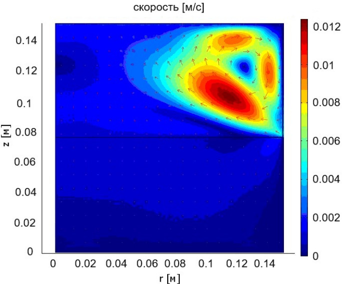 Рис. 9. Распределение поля скоростей в расплаве кремния высотой 0,015 м