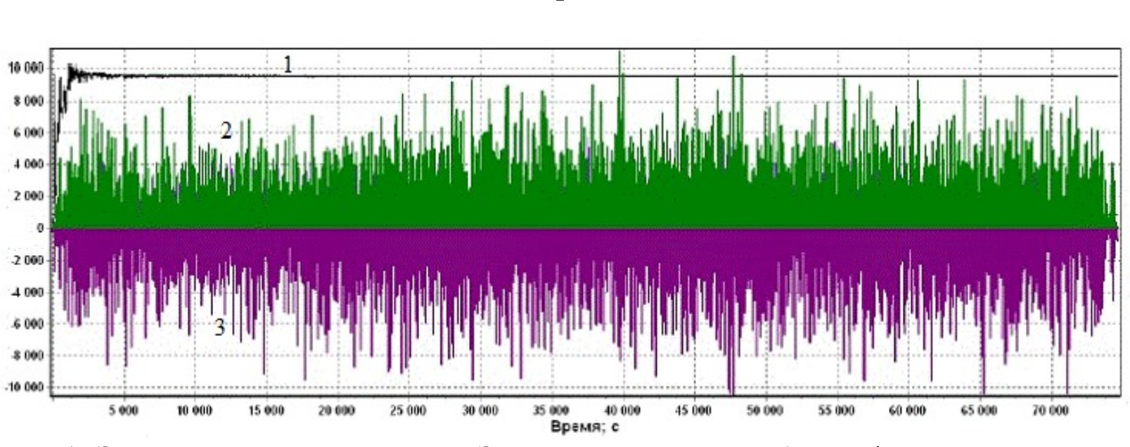 Рис. 1. Энергии заряда и разряда ЕНЭ, а также возможное КПД в функции времени за сутки. Ось абсцисс – секунды. Ось ординат – 1 – КПД емкостного аккумуляторного накопителя * 10 000; 2 – энергия зарядки накопителя, 3 – энергия, выданная накопителем