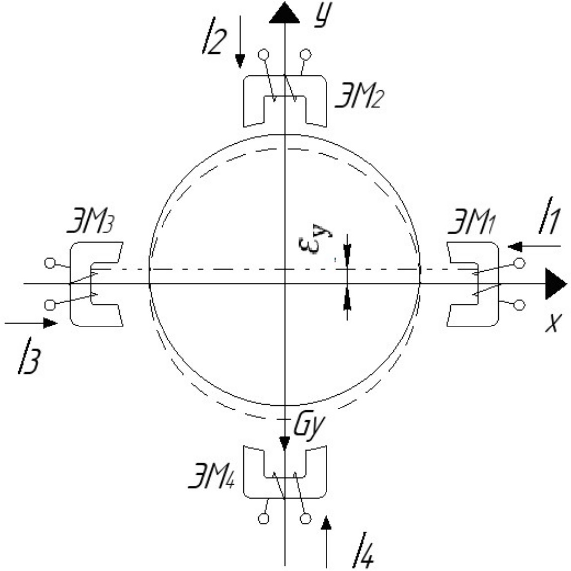 Рассмотрим случай, когда ротор какого-либо агрегата, оснащенного электромагнитными подшипниками, расположен горизонтально. Тогда компенсацию веса ротора будут производить радиальные электромагнитные подшипники. Расчетная схема одного радиального электромагнитного подшипника с учетом смещения центра магнитной системы относительно оси вращения приведена на рис. 1. Управление токами и электромагнитов ЭМ1 и ЭМ3, расположенных по оси , производится независимо от регулирования токами и электромагнитов ЭМ2 и ЭМ4, действующих по оси .