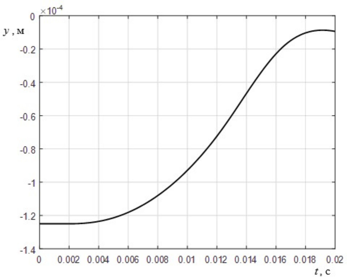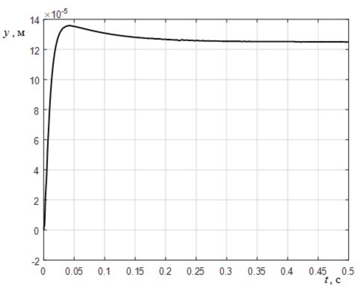 Расчетная модель позволяет построить график перемещения ротора из нулевого относительно центра магнитной системы положения в координату м (рис. 5). Он показывает, что при выбранных настройках регуляторов система управления электромагнитным подшипником работает устойчиво и при смещении центра магнитной системы относительно оси вращения ротора.