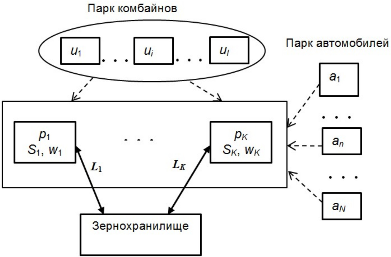 Задача назначения беспилотных комбайнов на поля в данной статье не рассматривается для простоты изложения предлагаемого подхода. Следует отметить, что описанная далее методика применима и к решению задачи назначения комбайнов для работы на полях по уборке урожая.