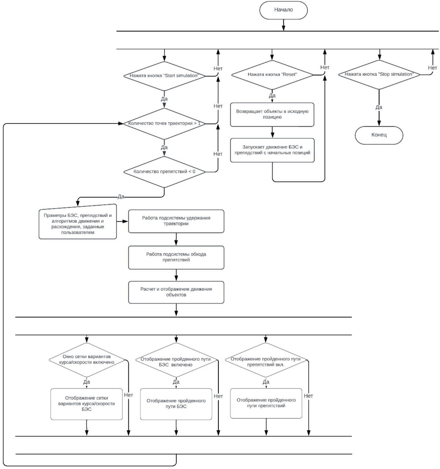 Разрабатываемый симулятор предназначен в первую очередь для проверки алгоритма движения по заданной траектории и расхождения с представляющими опасность препятствиями в соответствии с МППСС-72. К моделированию динамических характеристик БЭС и подвижных объектов не предъявляется особых требований, и оно допускается в упрощенном виде.
