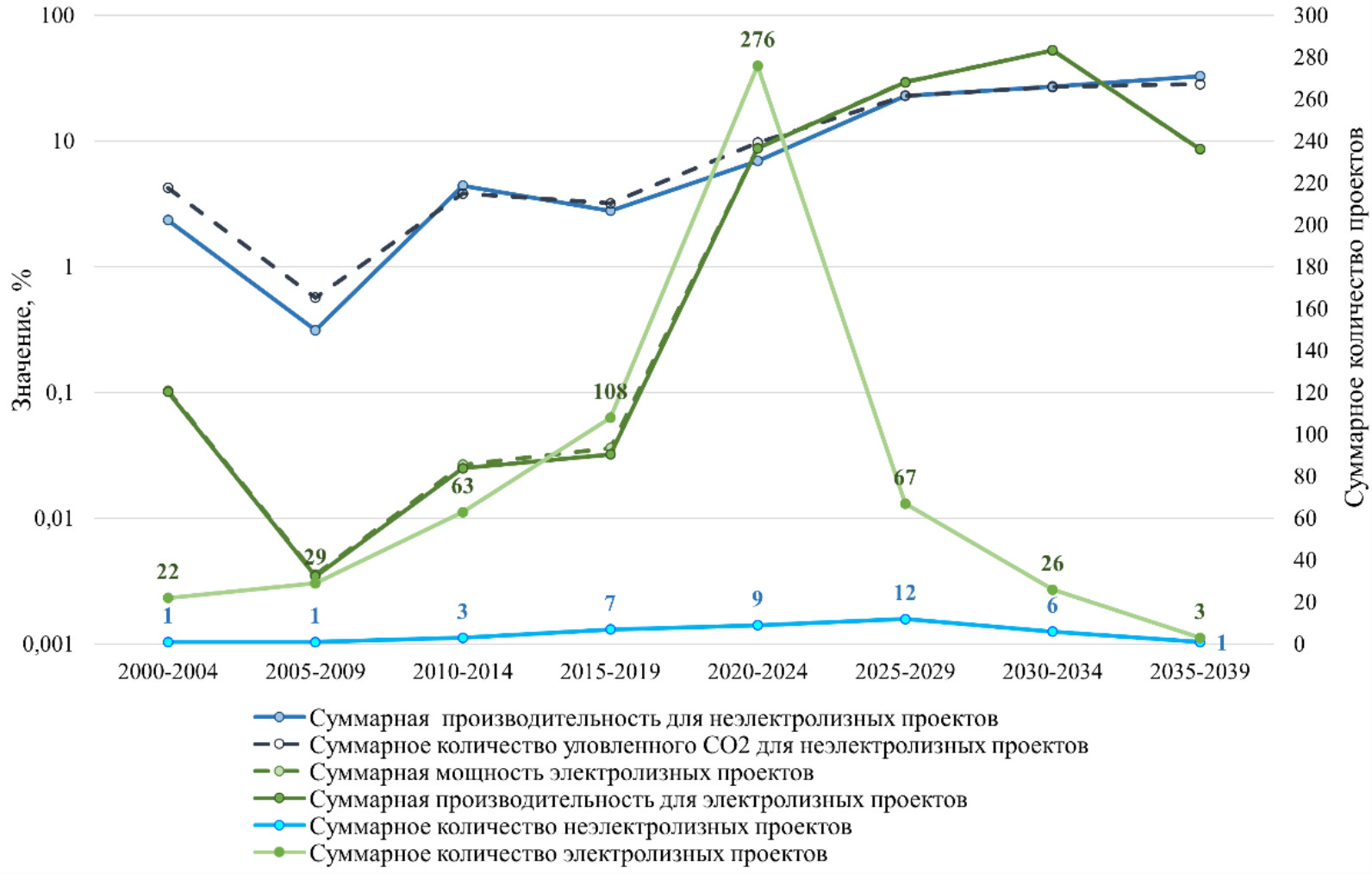 Рис. 1. Динамика изменения суммарной производительности проектов генерации водорода