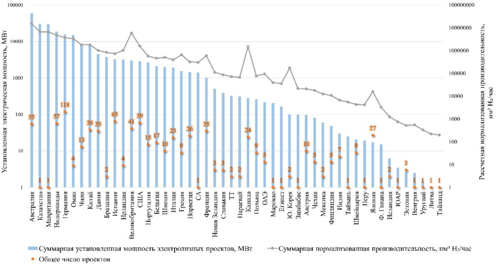 Анализ географического распределения проектов производства водорода (рис. 2) показал лидерство проектов из Австралии как по суммарной установленной электрической мощности (59500 МВт), так и по суммарной расчетной нормализованной производительности (15284,44 тыс. нм3H2/час); по числу проектов лидирует Германия (118 проектов).