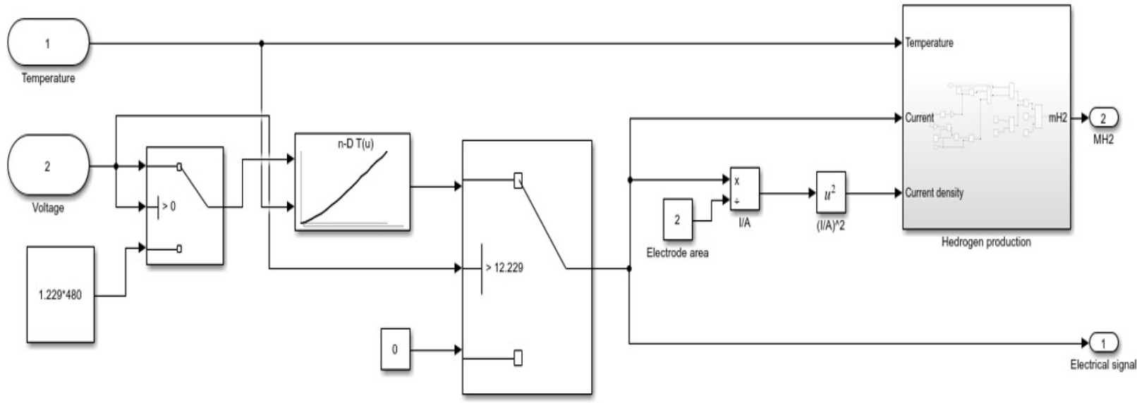 Экспериментальные данные, полученные с реальной физической установки, записываются в виде массива в блок табличного хранения данных «2-D Lookup Table», на вход которого подаются параметры температуры питательной воды или электролита и напряжения, а выходной величиной является сила тока [16].