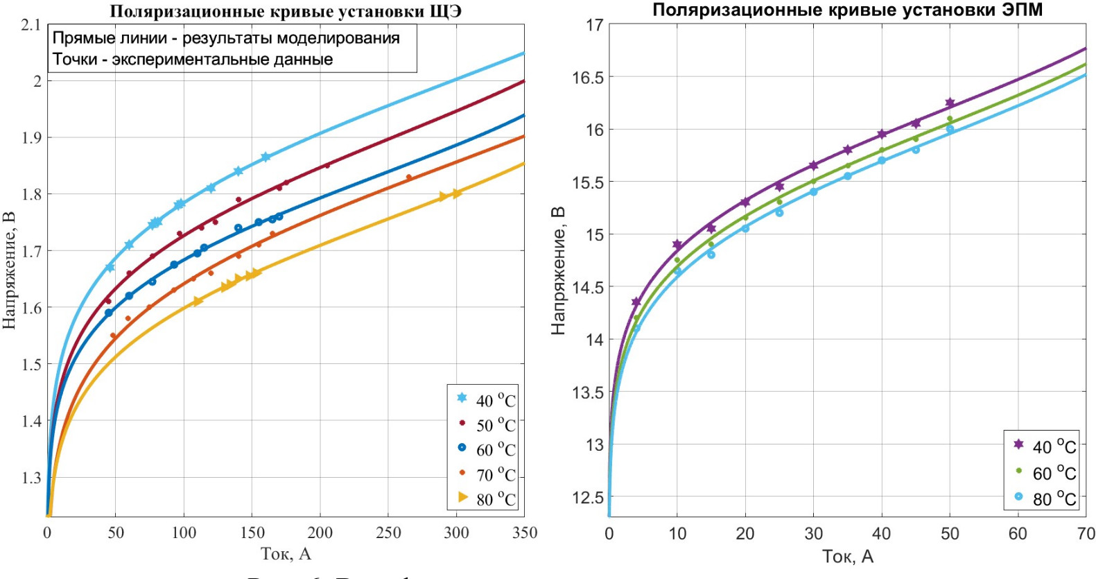 Процесс верификации результатов имитационного структурного моделирования проводился с использованием экспериментальных данных (рис. 6), полученных для ячеек электролизера щелочного типа с температурами электролита 40, 50, 60, 70, 80 °С и для электролизера с протонообменной мембраной для температур питательной воды 40, 60, 80 °С [8, 13].