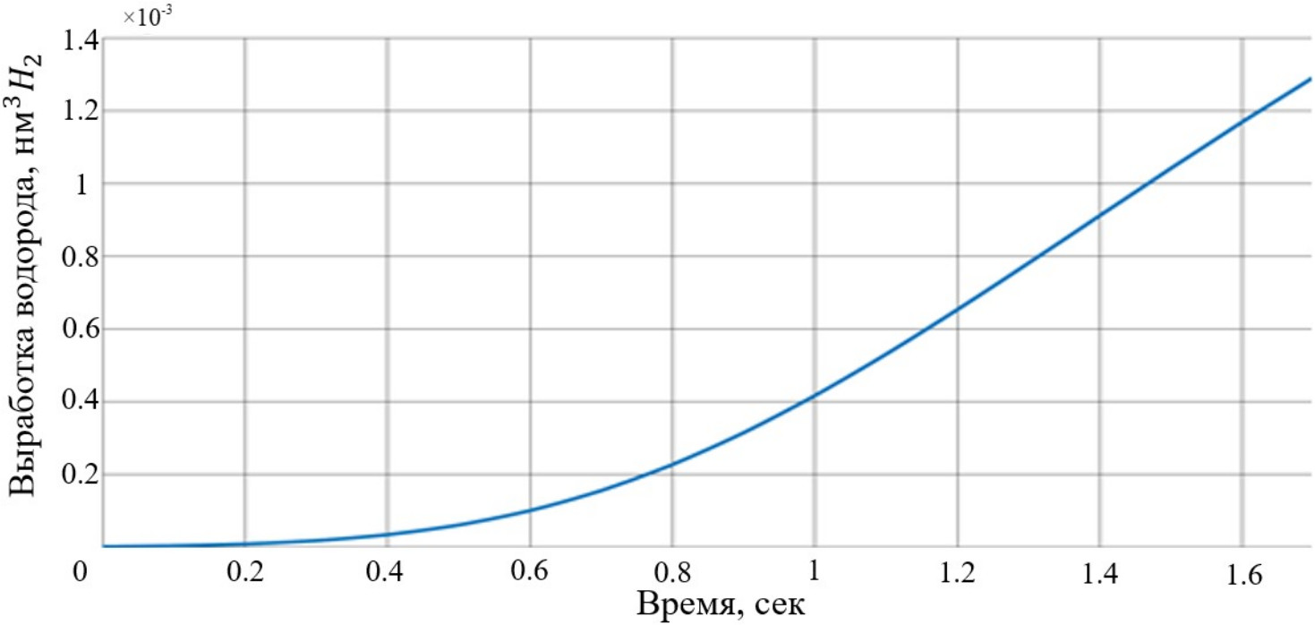 На рис. 7 представлена зависимость объема вырабатываемого водорода от времени для электролизной установки с протонообменной мембраной при температуре питательной воды 80 °C. Данная зависимость свидетельствует о том, что на вход электролизера непрерывно подается постоянный объем жидкости, в результате чего объем генерируемого водорода увеличивается (с постоянной скоростью начиная с определенного момента времени).