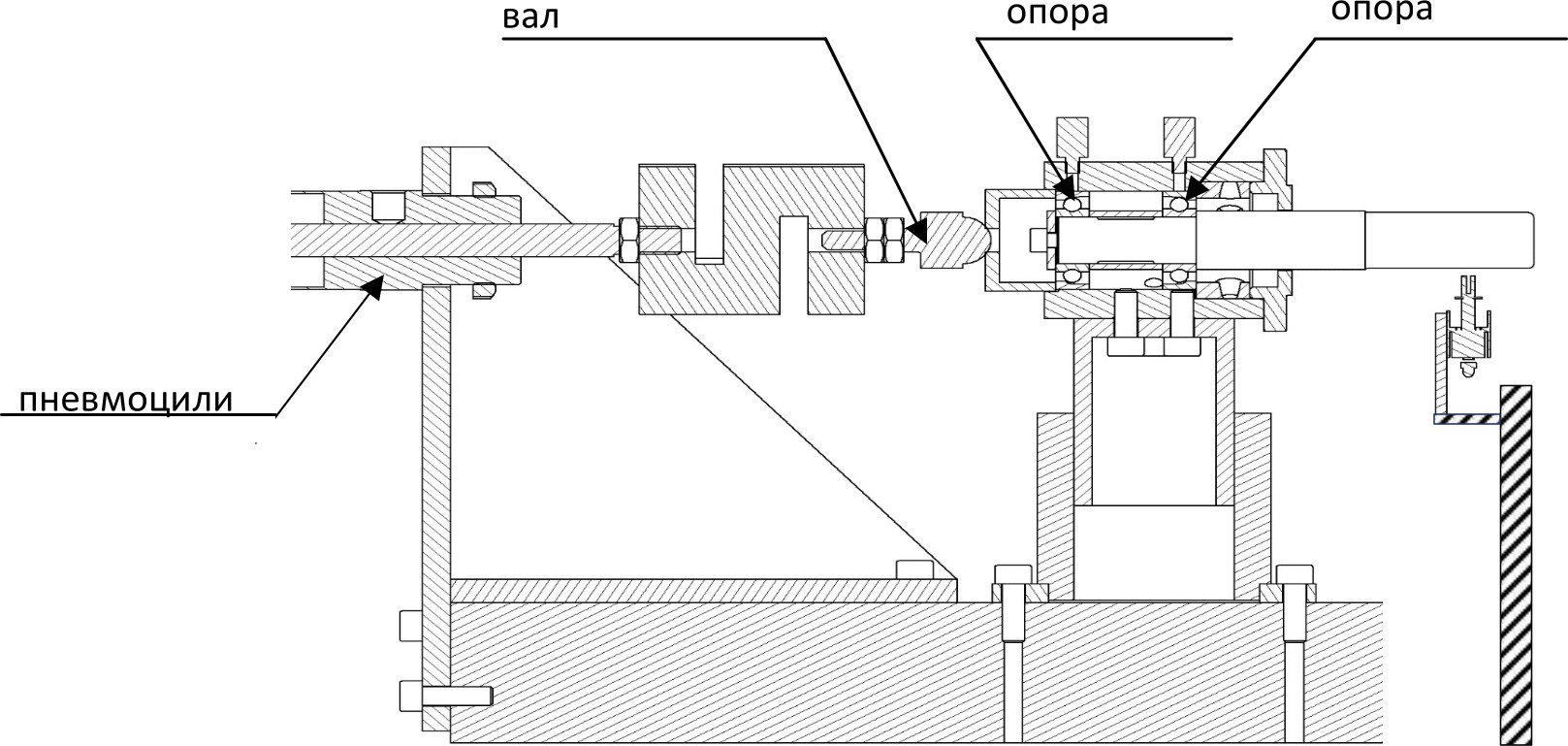 Стенд сконструирован таким образом, чтобы предварительный натяг в подшипниковом узле создавался за счет хода штока пневмоцилиндра. К штоку жестко прикреплен тензодатчик (для измерения и контроля силы предварительного натяга) с промежуточным валом. Шар из высокопрочной стали запрессован с противоположной стороны промежуточного вала и через чашевидную втулку равномерно передает усилие от пневмоцилиндра на наружную обойму заднего подшипника. Пневмоцилиндр установлен на вертикальном держателе, который жестко закреплен на массивной плите. На гильзе подшипникового узла отфрезерованы лыски параллельно и перпендикулярно к плоскости установочной плиты. На лысках над наружными обоймами подшипников нарезаны резьбы под установочные места акселерометров (см. рис. 2).