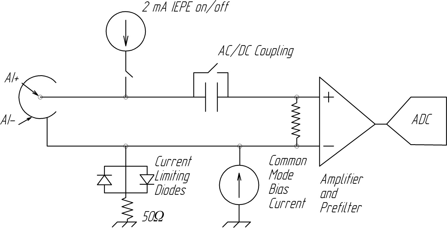 Сигнальная панель NI 9250 представляет собой модуль аналогового ввода с предварительной фильтрацией для интеллектуального подключения пьезоэлектрических датчиков (IEPE), а также сигналов постоянного и переменного тока, с частотой дискретизации до 51,2 кГц. Для оцифровки аналогового сигнала использовался 24-битный дельта-сигма АЦП. Схема входной цепи модуля NI 9250 приведена на рис. 3.