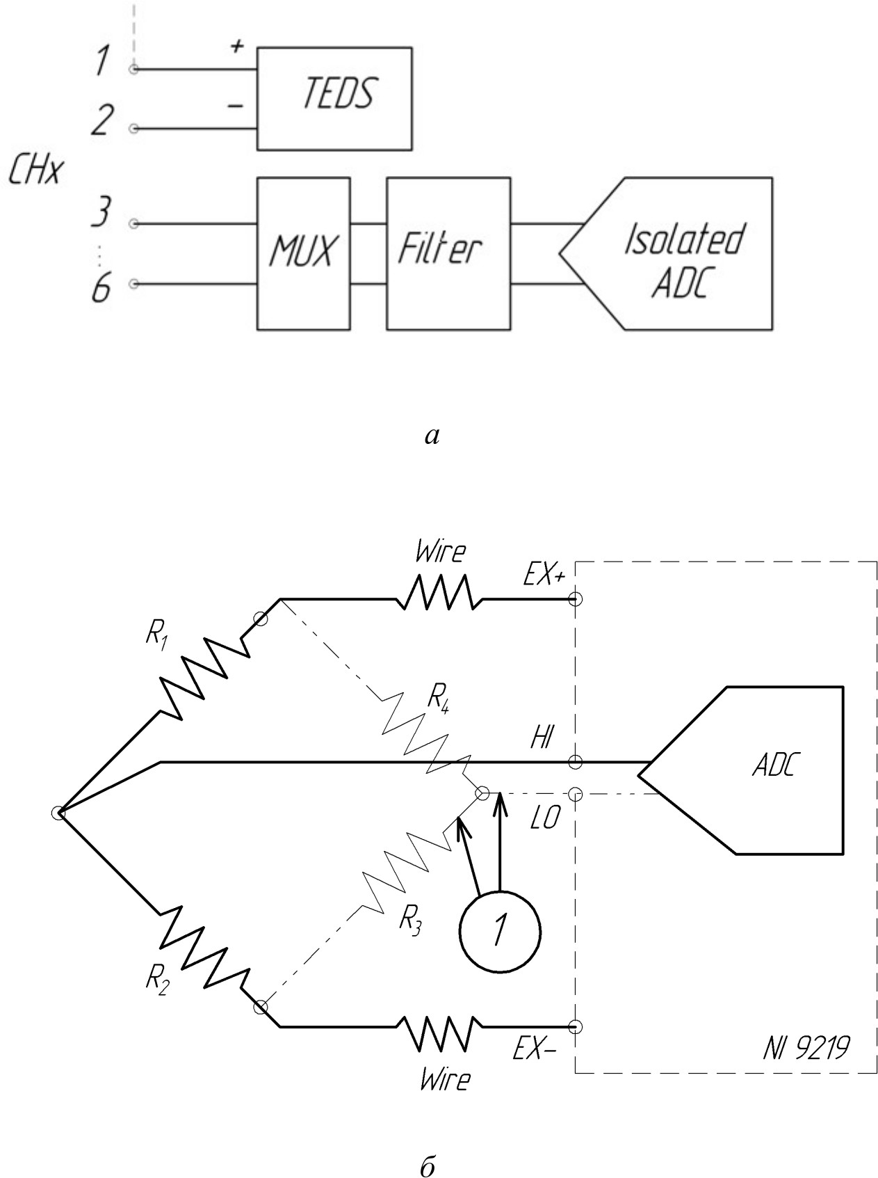 Панель NI 9237 представляет собой модуль с межканальной изоляцией. Модуль позволяет одновременно оцифровывать четыре входных аналоговых канала с помощью 24-разрядных АЦП. Схема возбуждения применялась во всех входных режимах, в которых необходимо возбуждение. АЦП совместно со схемами возбуждения реконфигурировались во всех режимах для согласования с каждым типом датчика. На рис. 4, а представлена входная цепь для одного канала NI 9237, а на рис. 4, б – схема подключения датчиков в полу- и полномостовой схеме.