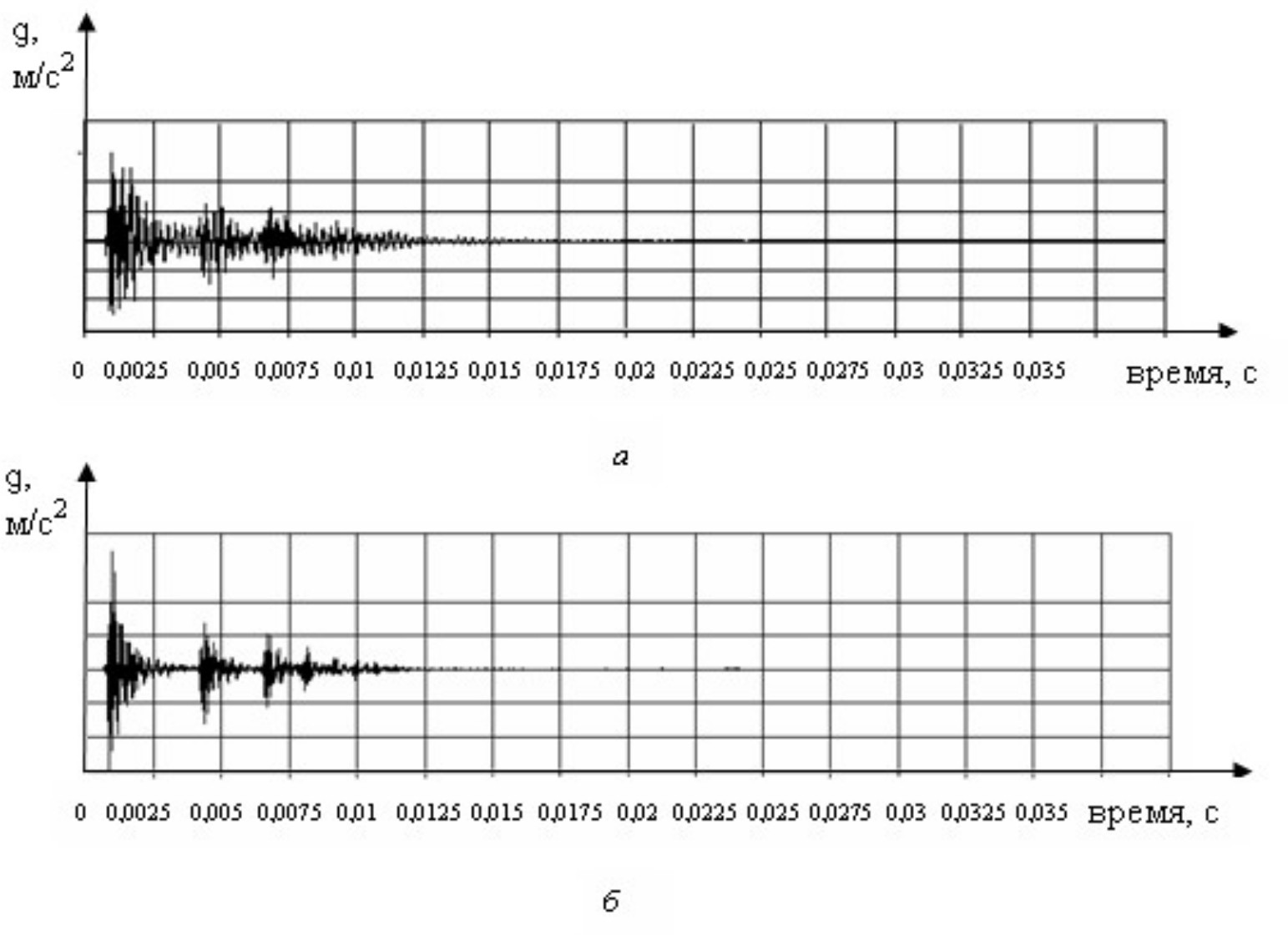 Рис. 5. Отклики виброускорения канала 0 и канала 1 при 150 Н: а – направления оси удара и оси акселерометра перпендикулярны; б – направления оси удара и оси акселерометра соосны