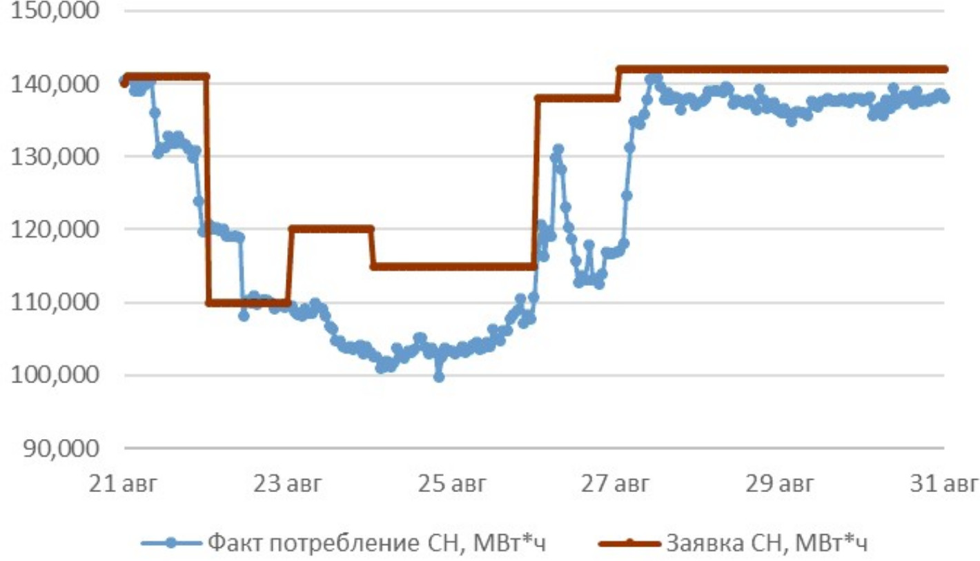 Рис. 2. Часть графика, отражающего фактические и прогнозные значения электропотребления системой СН АЭС за август 2021 года