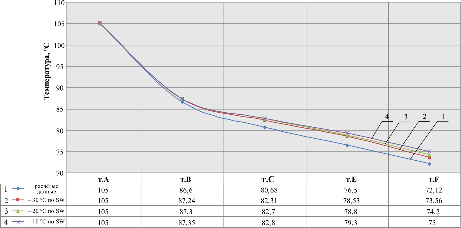 Сравнение кривых (рис. 4) показало, что мера разброса данных на рассматриваемых участках E и F не превышает 3 °С (≈4 %).