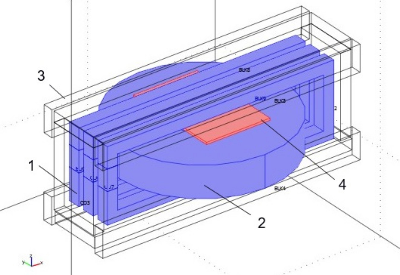 Рис. 4. Геометрическая модель индуктора с загрузкой: 1 – проводники индуктора; 2 – заготовка; 3 – пластины магнитопровода; 4 – пластина экранирующего магнитопровода