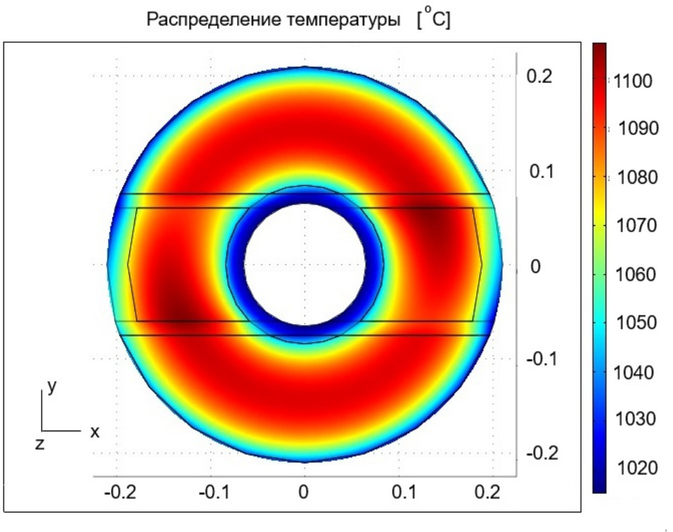 Приведенные на рис. 8 распределения температуры получены при неизменной во времени мощности тепловыделения. Использование системы регулирования температуры при контроле точки на боковой поверхности позволяет выровнять распределение до соответствия заданным требованиям. Полученное отклонение температуры в пределах всего объема кольца не превышает 5 %. Нужно учитывать, что достигнутый диапазон температур, равный 100 ºC, в системе управления преобразуется в отклонение от среднего значения. При заданном значении температуры, равном 1050 ºC, отклонение для распределения, представленного на рис. 8, составляет ºC.