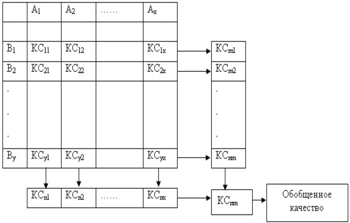 Параметры сопоставляются каждый с каждым, при этом при каждом сопоставлении выполняется КС-операция, т. е. оценивается в рамках выбранной шкалы степень соответствия параметра (анализируемого) требованиям, заложенным в данном параметре. Полученные значения качества по каждому столбцу и строке подвергаются соответствующей КС-операции, в результате чего получаем совокупность уровней качества по каждому параметру A и B, которые затем усредняются и комплексируются в обобщенное значение (уровень) качества, соответствующего этим критериям. Оно сопоставляется с нормативным значением, и принимается решение о соответствии параметров безопасности заданным требованиям. Если такого соответствия нет, то, решая обратную задачу, двигаясь по цепочке квалиметрических операций, можно выяснить причину несоответствия, т. е. определить то или те требования, которые не выполняются или не удовлетворяются, и принять соответствующие меры или согласиться с таким уровнем качества.