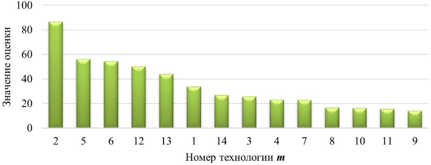 Результаты решения ЗМП 2.2 и 3.2 представлены на рис. 3 в виде оценок ресурсного потенциала и ранжированных комплексных многофакторных оценок ресурсосбережения и экологической безопасности различных технологий при переработке отходов в хранилище № 5. Выбор хранилища № 5 для демонстрации результатов расчетов связан с тем, что оценки в системе переработки, полученные по результатам решения всех ЗМП, входящих в алгоритм (см. рис. 1), являются максимальными для этого хранилища и технологий, применяемых для переработки НСО в нем ().
