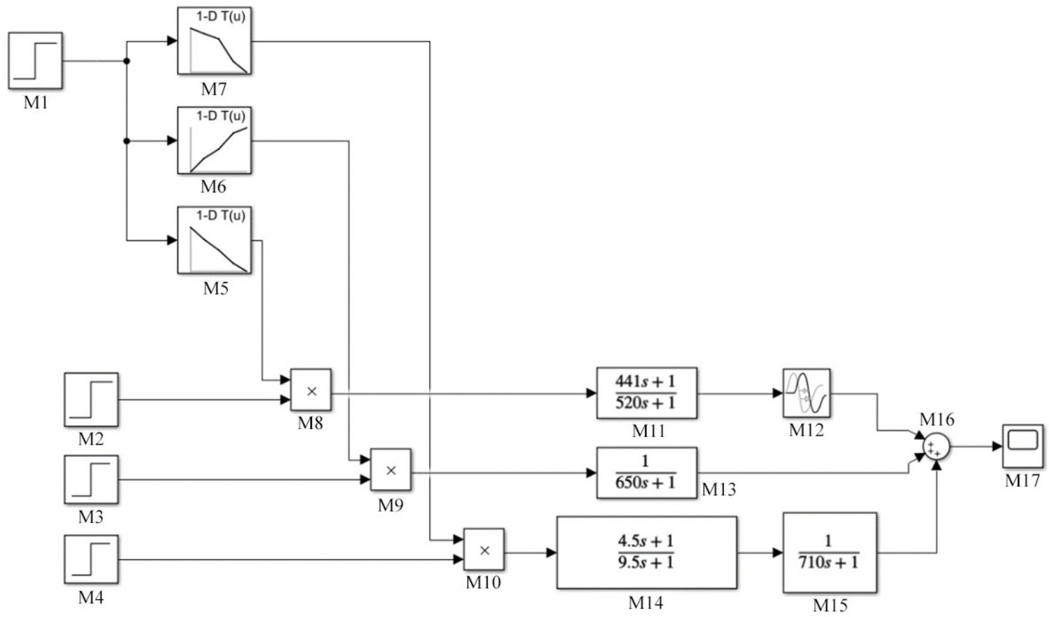 Блоки М1, М2, М3 и М4 обеспечивают возможность скачкообразного изменения скорости υв и температур , , соответственно. С их помощью производится вывод объекта в рабочую точку и задание приращений управляющего и возмущающих параметров для исследования динамики в малой окрестности рабочей точки. Блоки М5, М6, М7 соответствуют нелинейным функциям , , , связывающим коэффициенты , , со скоростью воздуха υв. Множительные блоки М8, М9, М10 аналогичны операторам умножения структурной схемы. С помощью блоков М11, М12, М13, М14 и М15 задаются передаточные функции , , . Причем блок М12 позволяет учесть величину времени запаздывания в передаточной функции . Формирование выходной величины как суммы выходных сигналов обозначенных передаточных функций осуществляется с помощью блока М16. Для наблюдения переходных процессов в объекте управления введен осциллограф М17.