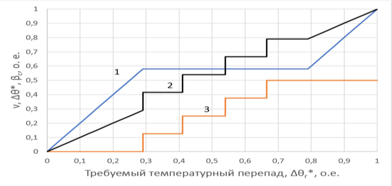 Требуемый температурный перепад на интервале от 0 до 0,5 о. е. обеспечивается изменением скорости вентиляторов частотно-регулируемой группы АВО (график 1 на рис. 5) от до номинального значения о. е. Фактический температурный перепад на первом интервале управления в стационарных режимах поддерживается равным требуемому (график 2 на рис. 5).