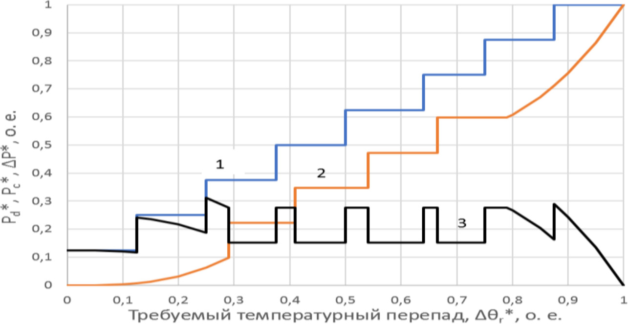 Рис. 5. Зависимость относительных значений переменных от требуемого температурного перепада для упрощенного алгоритма управления: 1 – скорость вентиляторов; 2 – фактический температурный перепад; 3 – количество включенных дискретно-регулируемых двигателей