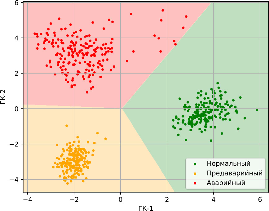 С практической точки зрения это означает, что выбранная признаковая репрезентация и понижение размерности формируют режимно-диагностическую карту, на которой состояния различаются без двусмысленности. Вероятностная модель смешанного гауссова распределения дополняет геометрическую разделимость количественной мерой уверенности , что позволяет вводить простое правило принятия решения по порогам и гистерезису без ухудшения качества.