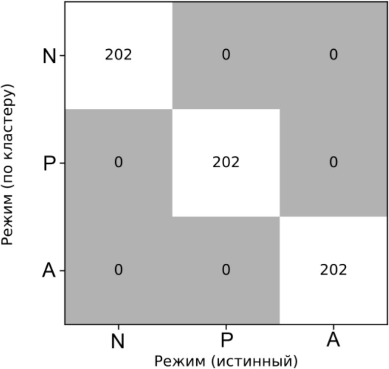 Неконтролируемые методы k-средних и модель смешанного гауссова распределения формируют три неперекрывающихся кластера, а полученные матрицы ошибок для обоих методов диагональны и составляют по 202 окна на диагонали для каждого режима (рис. 3). Это эквивалентно нулевым ошибкам I и II рода для всех классов (𝛼=𝛽=0).