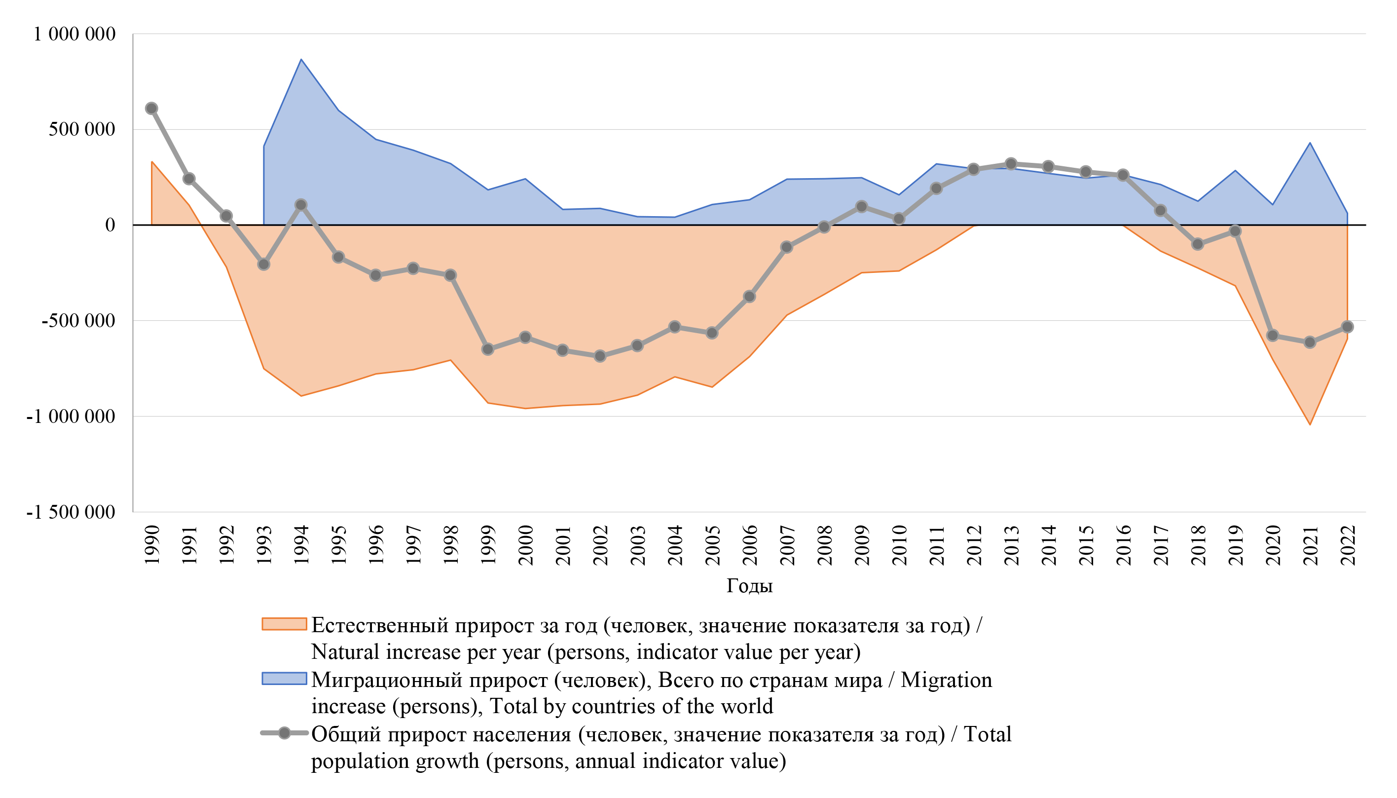 Рис. 1. Компоненты изменения общей численности российского населения в 1990–2022 гг., чел.