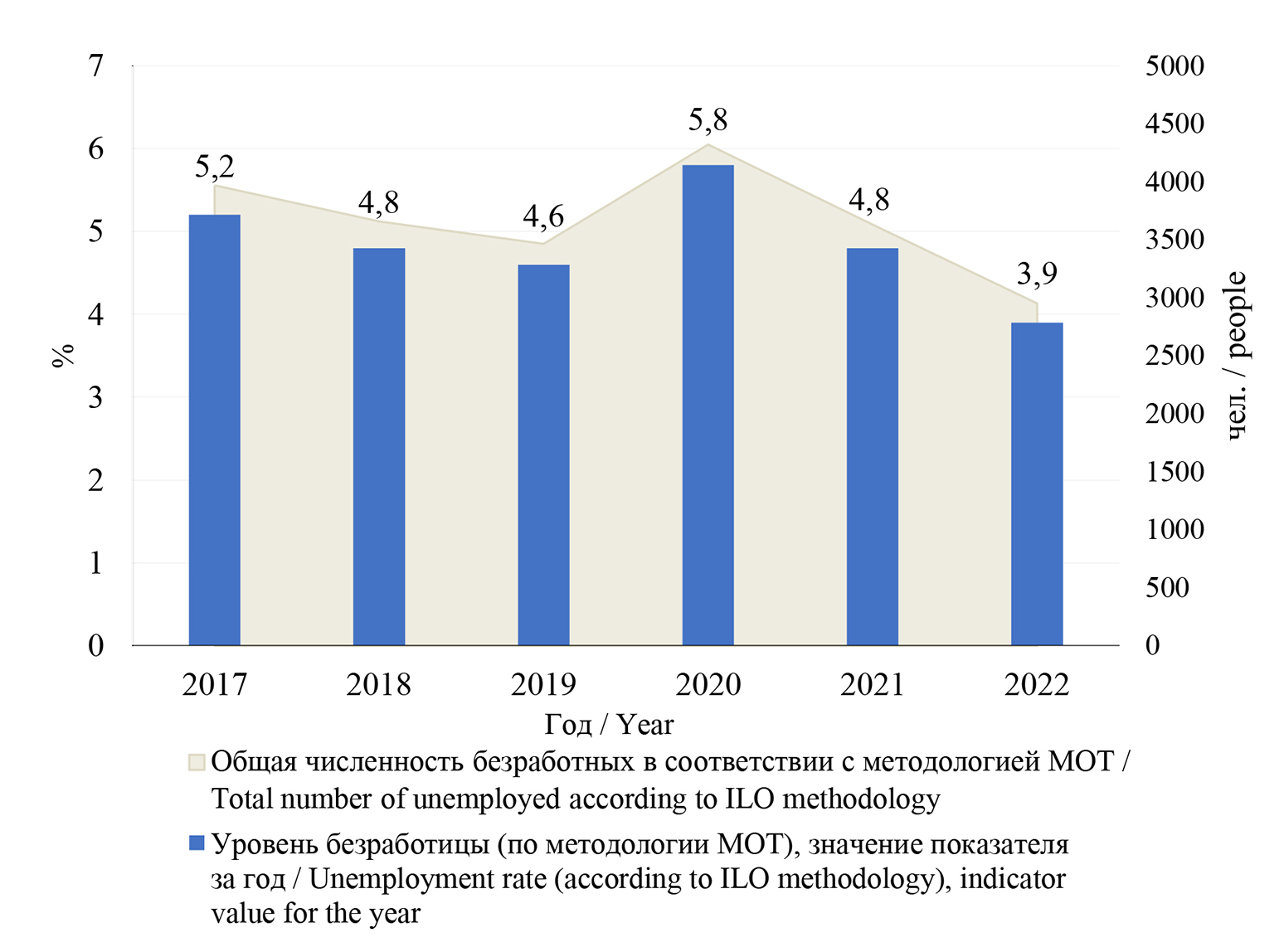Рис. 2. Общая численность безработных в соответствии с методологией Международной организации труда (МОТ) и уровень безработицы (по методологии МОТ) в 2017–2022 гг.