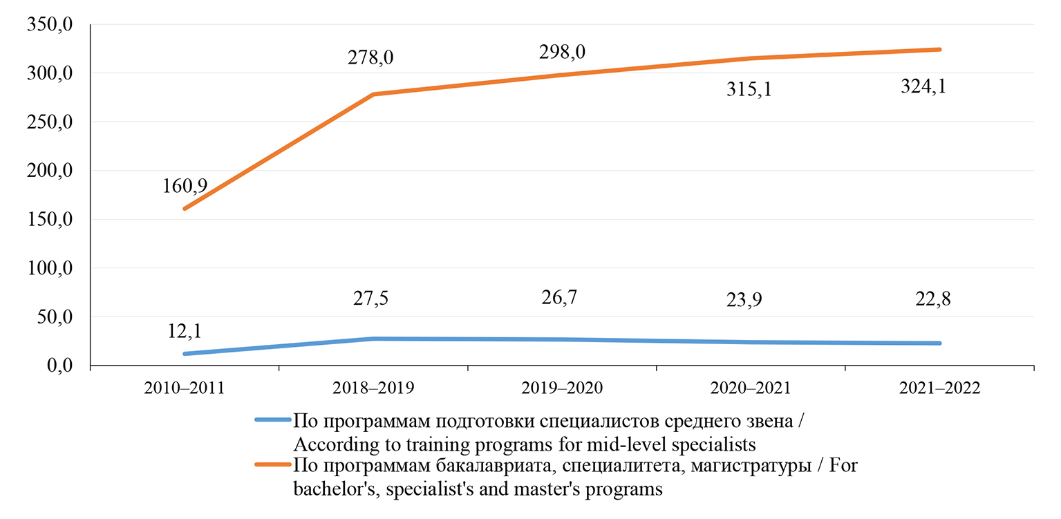 Численность иностранных студентов, обучающихся в России. По результатам изучения динамики численности иностранных студентов, обучающихся по программам подготовки специалистов среднего звена и высшего образования в России в 2010–2011 учебном году и в период с 2018–2019 по 2021–2022 учебные годы выявлено преобладание студентов, обучающихся по программам высшего образования. Более 90 % иностранных граждан, обучающихся в России – студенты программ бакалавриата, специалитета или магистратуры. За рассматриваемый период численность иностранных студентов увеличилась на 173,9 тыс. чел.: по программам подготовки специалистов среднего звена на 10,7 тыс. чел., по программам высшего образования – 163,2 тыс. чел. Данное изменение свидетельствует о двукратном увеличении по всем категориям до 346,9 тыс. чел. (рис. 3).