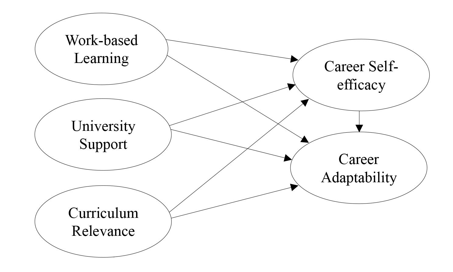 Many studies have discussed the important role of career adaptability. However, the role of work-based learning, curriculum relevance, university support, and career self-efficacy in strengthening career adaptability has not yet been discussed. Therefore, this study investigates the influence of work-based learning, curriculum relevance, and university support on career adaptability through career self-efficacy of vocational students in higher education. Specifically, the purpose of the study is tested by the direct influence of independent variables (work-based learning, curriculum relevance, university support, and career self-efficacy) on career adaptability. Also, this study aims to test the mediating role of career self-efficacy in the relationship between independent factors (work-based learning, curriculum relevance, and university support) and vocational students’ career adaptability.