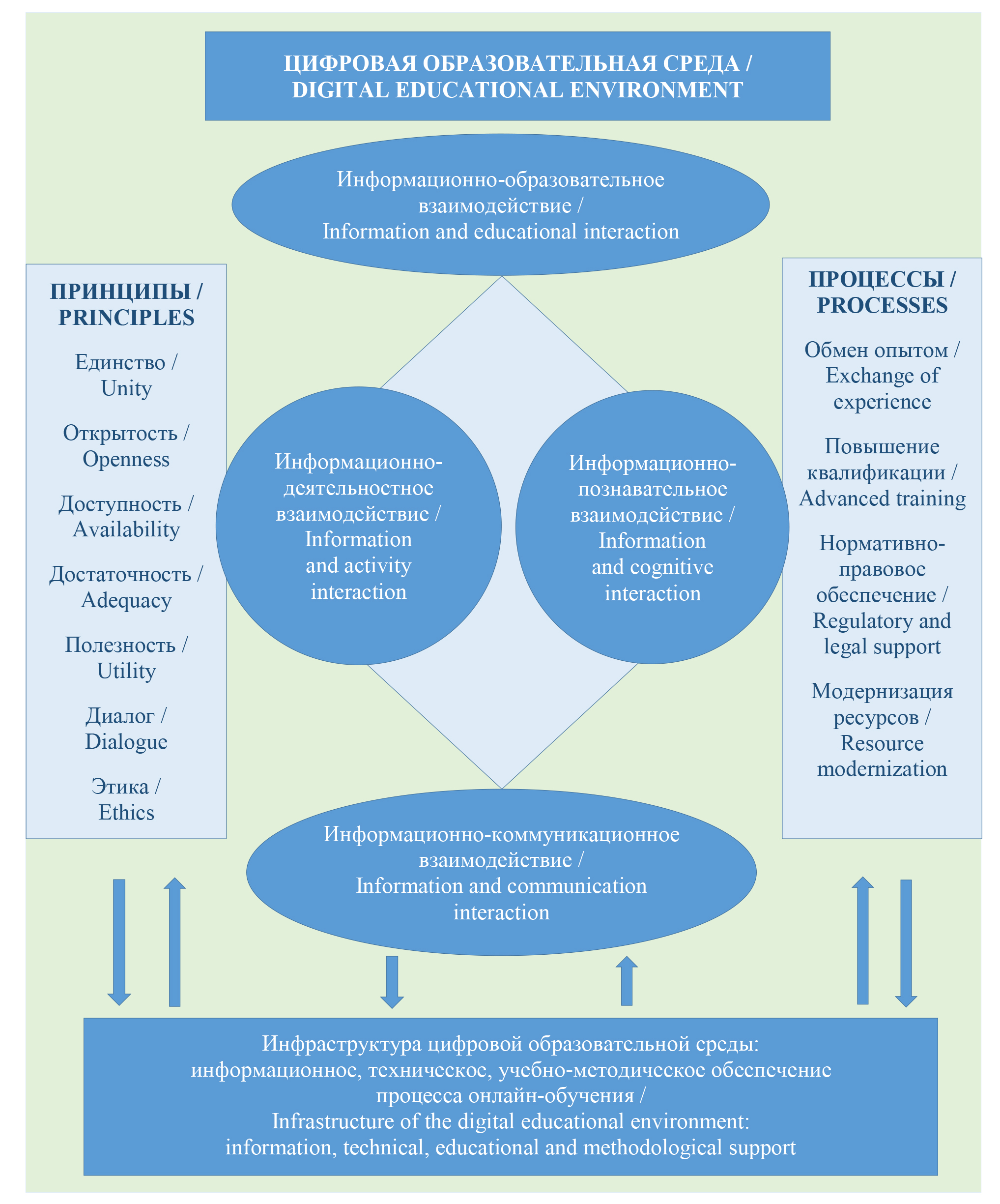 Теоретико-методический аспект исследования. На основе теоретического анализа сформировавшегося понятийного аппарата в отношении категории «цифровая образовательная среда» выявлено, что ключевыми понятиями в данной категории являются: «образовательная среда» и «информационная образовательная среда» [26]. В термин «образовательная среда» заложены следующие смыслы: окружение, взаимодействие обучающихся и обучающих1, возможности для развития личности и условия ее формирования2. В определениях понятия «информационная образовательная среда» исследователи делают акцент на ресурсном, технологическом обеспечении процессов сбора, хранения и передачи, а не на педагогических и воспитательных смыслах такой среды.