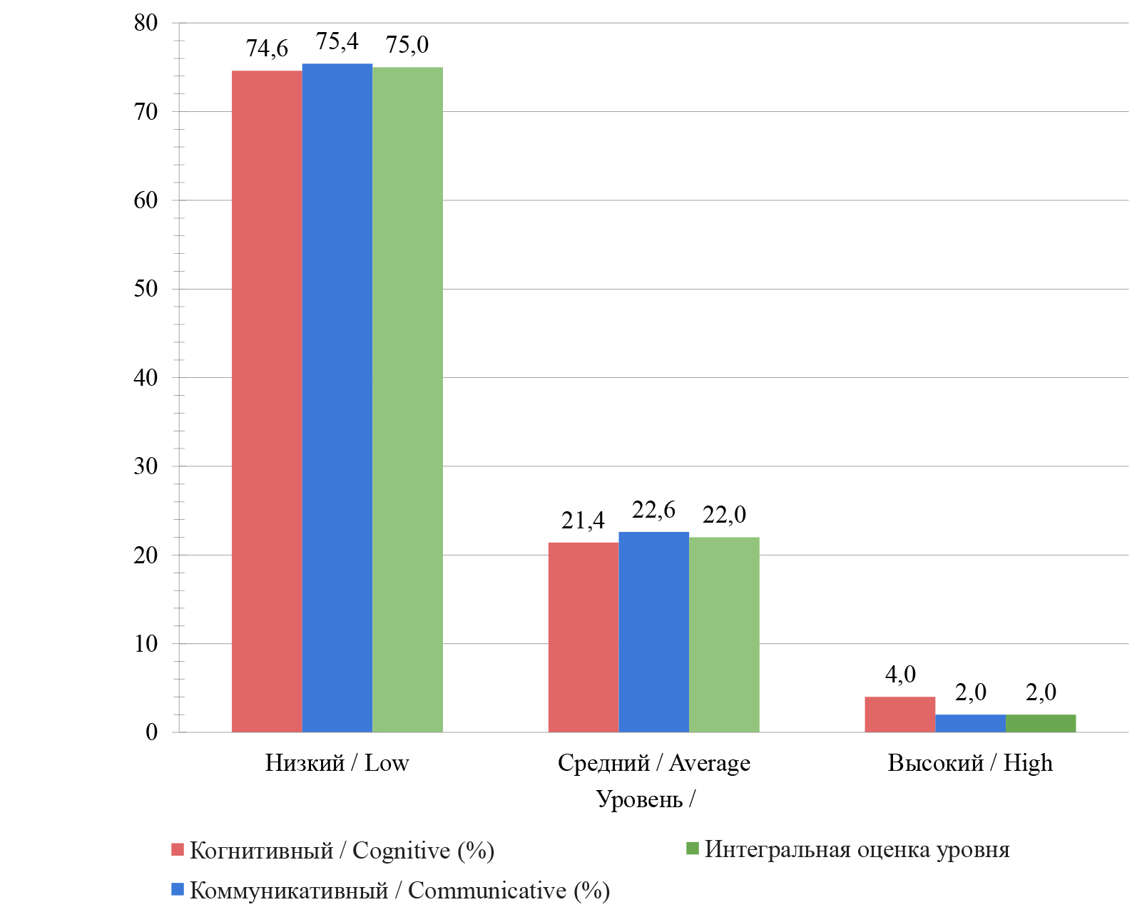 Взаимосвязь между когнитивным и коммуникативным уровнями П-ИНДК изучалась расчетом коэффициента корреляции Пирсона. Установлена сильная положительная корреляция между сформированностью когнитивных и коммуникативных умений в структуре П-ИНДК (r = 0,85; p < 0,001).