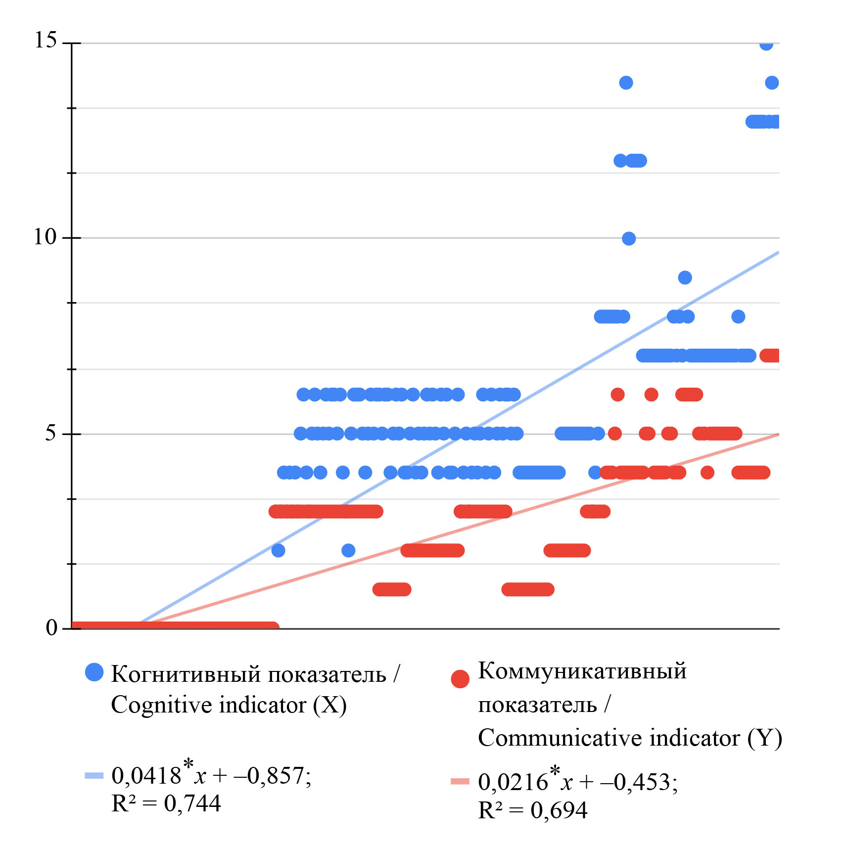 Р и с. 3. Диаграмма рассеяния взаимосвязи когнитивных и коммуникативных показателей П-ИНДК