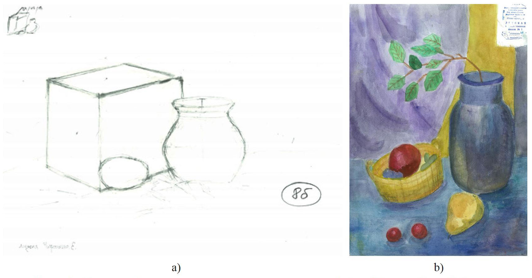 Примеры работ творческого экзамена, выполненных на средние баллы (рисунок, живопись) представлены на рисунке 4.