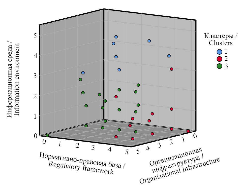 В таблице 3 представлены обобщенные характеристики инфраструктуры проектного обучения каждого кластера. Она отражает распределение индексов инфраструктуры проектного обучения в региональных российских вузах в зависимости от принадлежности к трем кластерам, которые различаются по степени развития трех ключевых элементов инфраструктуры: нормативно-правовой базы, организационной инфраструктуры и информационной среды. Каждый кластер имеет свой сводный индекс общего уровня зрелости инфраструктурной среды проектного обучения.