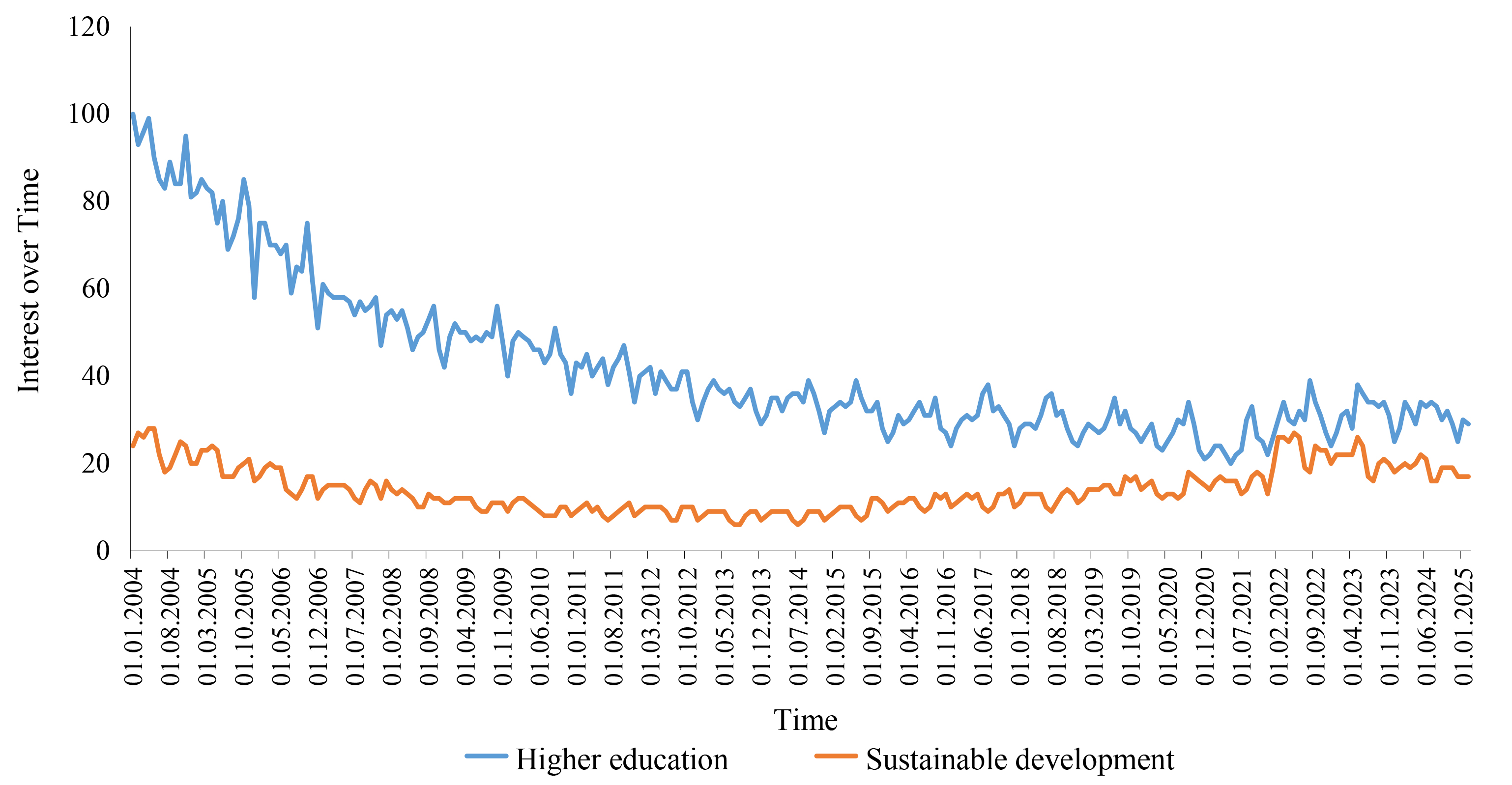 Online Frequency Dynamics. It needs to be stressed that in recent years, higher education, sustainable development, and COVID-19 pandemic became the widely searched terms that often intertwined together from 2020 onwards. Furthermore, figure 2 below depicts the results of the analytical scanning based on the Google Trends toolkit3 (which is recently popular with researchers analyzing online word searches) showing the frequency dynamics of the worldwide search requests (simultaneous search for the group of items) for such terms as “higher education” and “sustainable development” from 2004 (the first year when the Google search data is available) until today. Figure 2 features the “Interest over Time” (IoT) metrics which assesses the search interest relative to the highest point on the chart for the given region and time (with 100 being the peak popularity and 0 showing that no data was available for the given region and time period). Looking at figure 2, one can clearly observe that the interest and focus on the term “sustainable development” became entangled with that of “sustainable education” by 2021 measured according to the Interest over Time metrics.