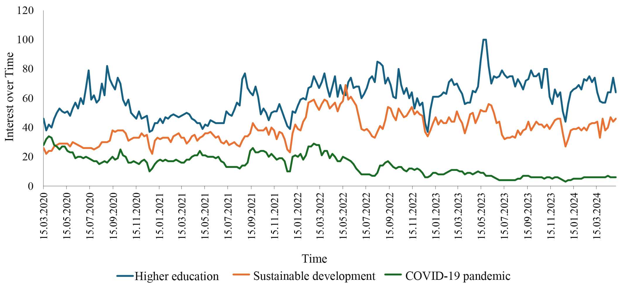 F i g. 3. The worldwide dynamics of frequency of search requests of the concepts of “higher education”, “COVID-19 pandemic”, and “sustainable development” (2020–2024)